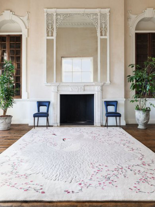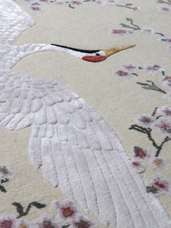 Khả năng kể chuyện đầy sáng tạo của Mr Vũ đã được thể hiện qua tấm thảm hoa văn đôi hạc, hợp nhất thành từng chùm lông vũ và được bao bọc bởi những bông hoa anh đào lụa thanh lịch. Phần nền của tấm thảm là chất liệu len mềm mại, trong khi những chú chim tinh tế được tỉa nổi tỉ mỉ bằng sợi lụa.